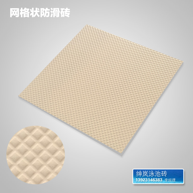 型号:SL244-1 规格:244*244*9mm 体育馆比赛池池岸专用防滑砖,规格244x244mm,留缝6mm,专业尺寸和配件和池内砖尺寸一致,铺贴是能对缝,池岸更美观!!!